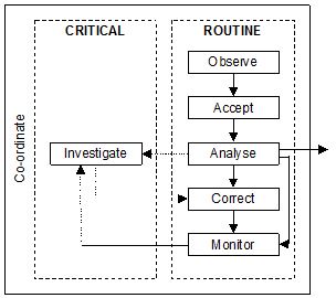 Investigation is any activity that aims to discover the underlying factors order to deal with the fault or problem. At this stage, system schematics or other such diagrams can be helpful. Coding techniques (e.g., group, colour, shape) again need to be considered fully to ensure that they support this stage without detracting from their usefulness elsewhere. Displays of system performance need to be designed carefully in terms of information presentation, ease of update, etc.