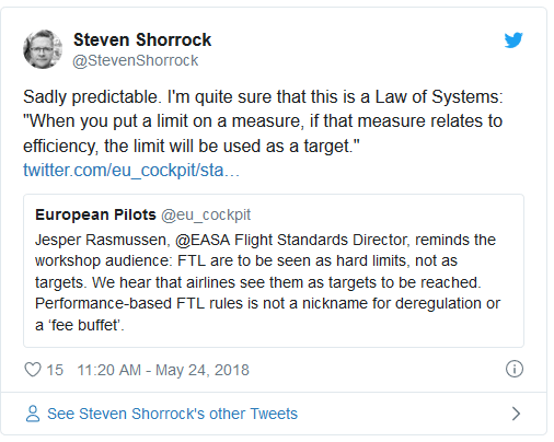 In May 2018, the ECA twitter account reported that EASA’s Flight Standards Director Jesper Rasmussen reminded a workshop audience that FTLs are to be seen as hard limits, not as targets.
