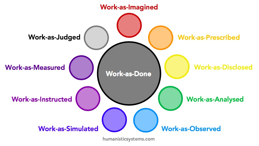 In any attempt to understand or intervene in the design and conduct of work, we can consider several kinds of ‘work’. In practically all attempts at understanding and intervention, however, we are not considering actual purposeful activity – work-as-done. Rather, we use proxies for work-as-done as the basis for understanding and intervention. There are several reasons for this. One is that work itself is so variable, in the short and long term. The same sort of work can often be done in many different ways, in terms of the actual activity performed and its sequence, timing, coordination, and so on. And the way that people work changes over time. Another reason is that much of what we consider ‘work’ is unknowable; it takes place in the head and is not available for observation or even introspection. Even when work is observable by others, or describable by those who do the work, what is observed or described is likely to be partial and even biased – deliberately or not.