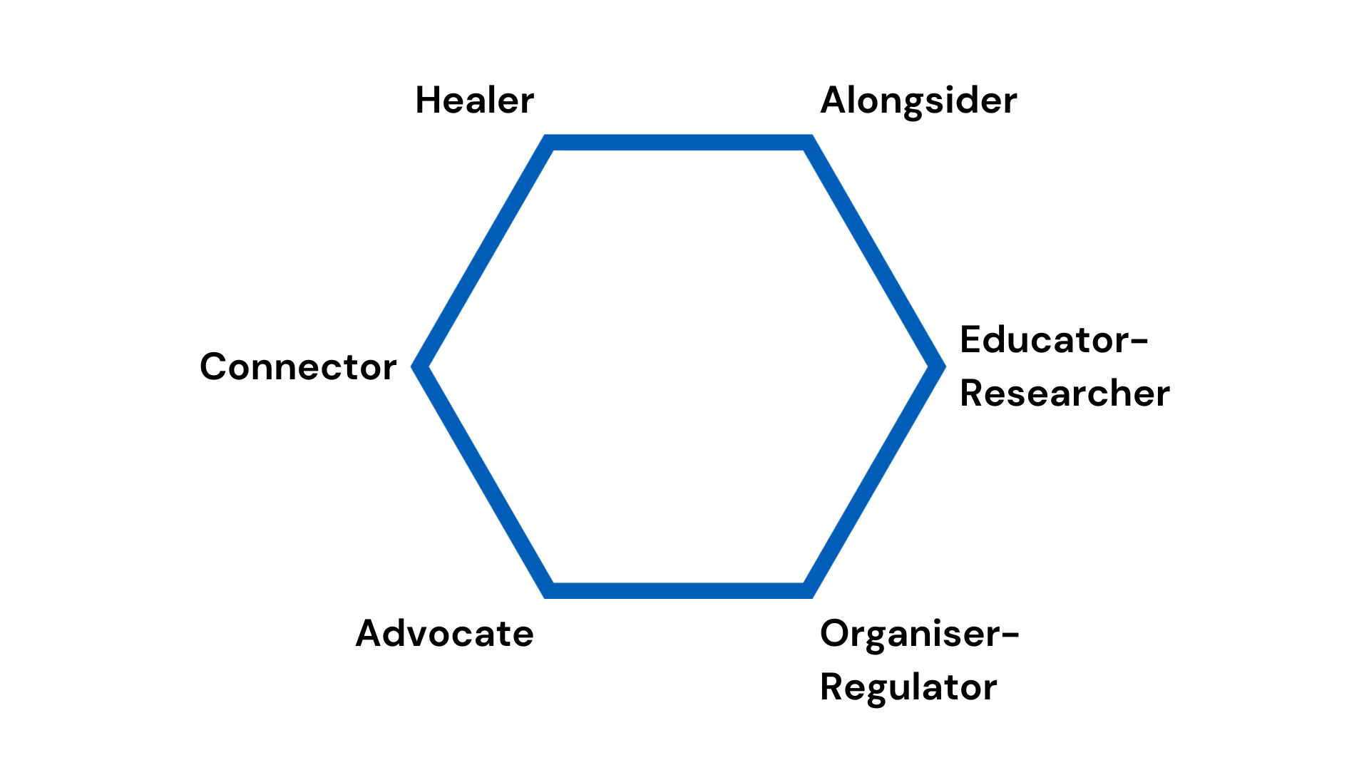 In my previous post on the Helping Octagon, I outlined eight roles relevant to helping people through the struggles and challenges of life. The roles are all important, but we tend to associate some roles with mental health and wellbeing directly, and other roles only indirectly or not at all. We also generally think of other people – and a range of people – as occupying these roles. These people are often difficult to access directly. What we may not always appreciate is that each of us often occupies each of these roles for ourselves (as well as for people we love and for whom we care). In doing so, change is done by us and with us. The Helping Hexagon is an adaptation of the Helping Octagon, with four of the roles combined into two. One way to use the Helping Hexagon is to ask ourselves questions of ourselves for each role. This post presents some possibly useful questions from my own experience, from which you can generate your own questions.